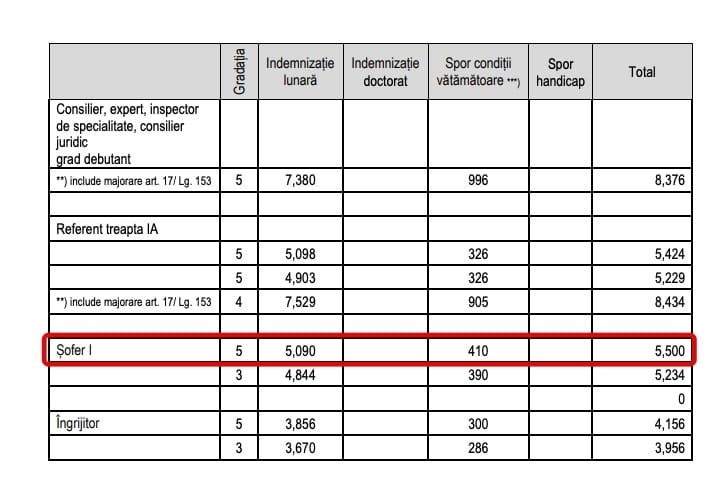 Concret, șoferul de pe grila Ministerului Educației câștigă o îndemnizație lunară de 5.090 de lei, la care se adaugă un spor de condiții vătămătoare de 410 de lei, în total 5.500 de lei pe lună. Pentru postul de șofer sunt necesare studii medii, adică liceul.