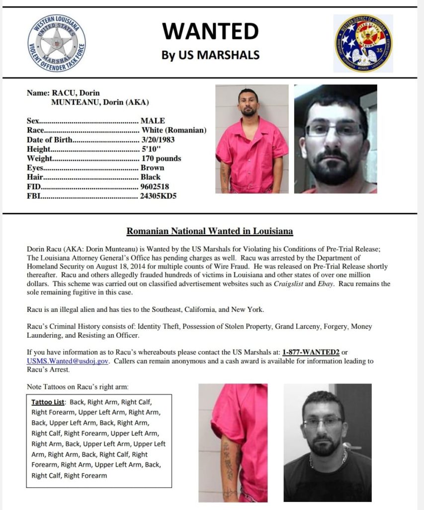 Dorin Racu este străin ilegal și are legături cu sud-estul regiunii Louisiana, California și New York. Istoricul penal al lui Dorin Racu este format din: furt de identitate, deținere de bunuri furate, fals, spălare de bani și opunere de rezistenţă în fata unui ofițer.”