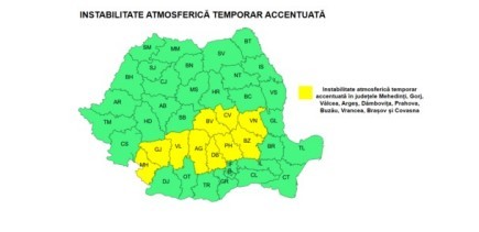 ”În judeţele Mehedinţi, Gorj, Vâlcea, Argeş, Dâmboviţa, Prahova, Buzău, Vrancea, Braşov şi Covasna vor fi perioade cu instabilitate atmosferică accentuată. Aceasta se va manifesta prin averse torenţiale, descărcări electrice, intensificări ale vântului (rafale de 50…55 km/h) şi izolat vijelii şi grindină. În intervale scurte de timp (1…3 ore) cantităţile de apă vor fi de 20…25 l/mp şi izolat de peste 35 l/mp”, a transmis ANM.