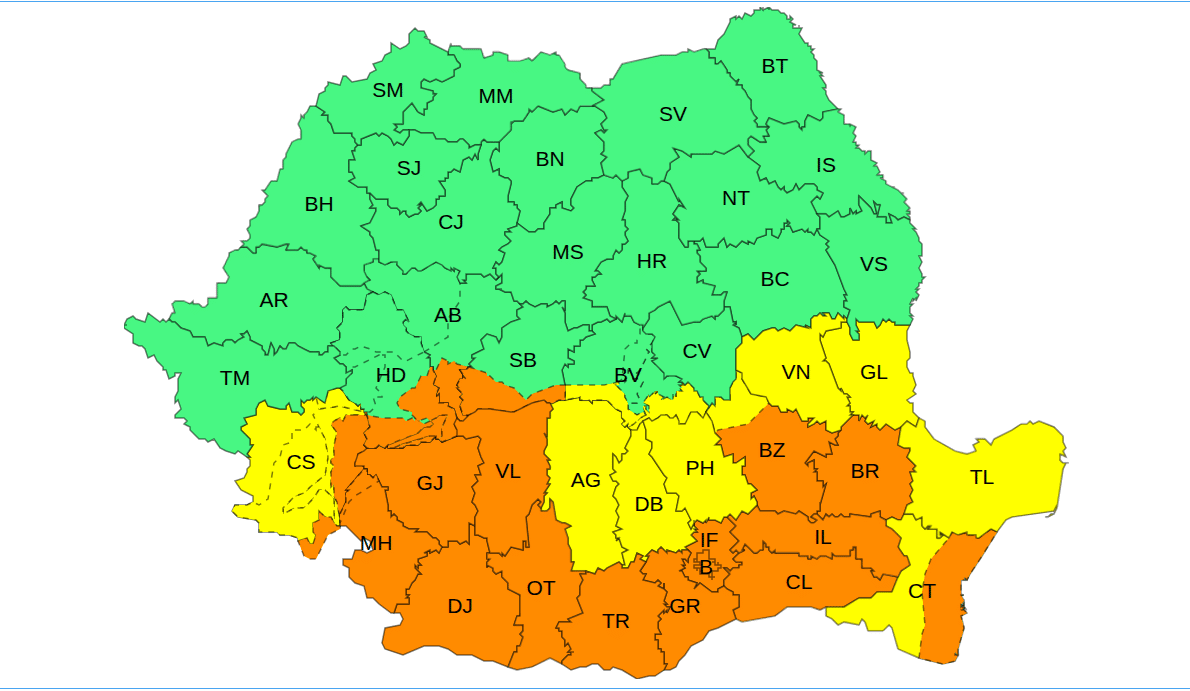 De joi, ora 20:00, până vineri dimineață la ora 10:00, în județele Teleorman, Giurgiu, Călărași, Ialomița, Brăila, Buzău, Ilfov, în municipiul București și în zona de litoral a județului Constanța, vântul va avea intensificări puternice și susținute cu rafale de 70…85 km/h.