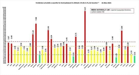 Cluj are 355 de cazuri noi, 5,93 incidență la mia de locuitori și 48.682 de cazuri în total.